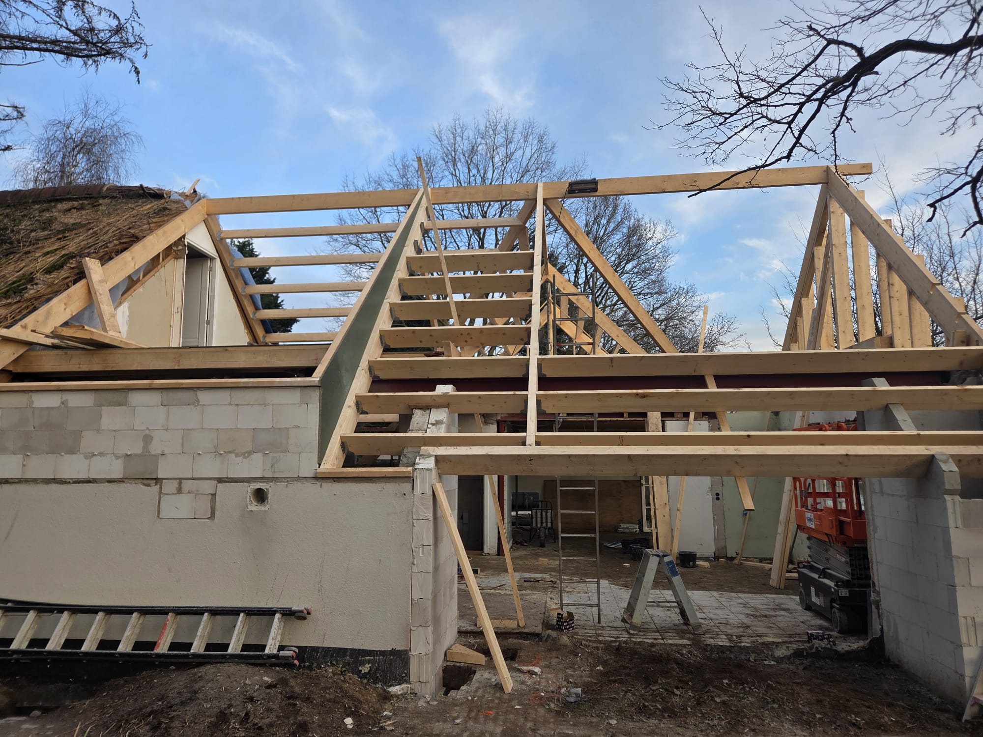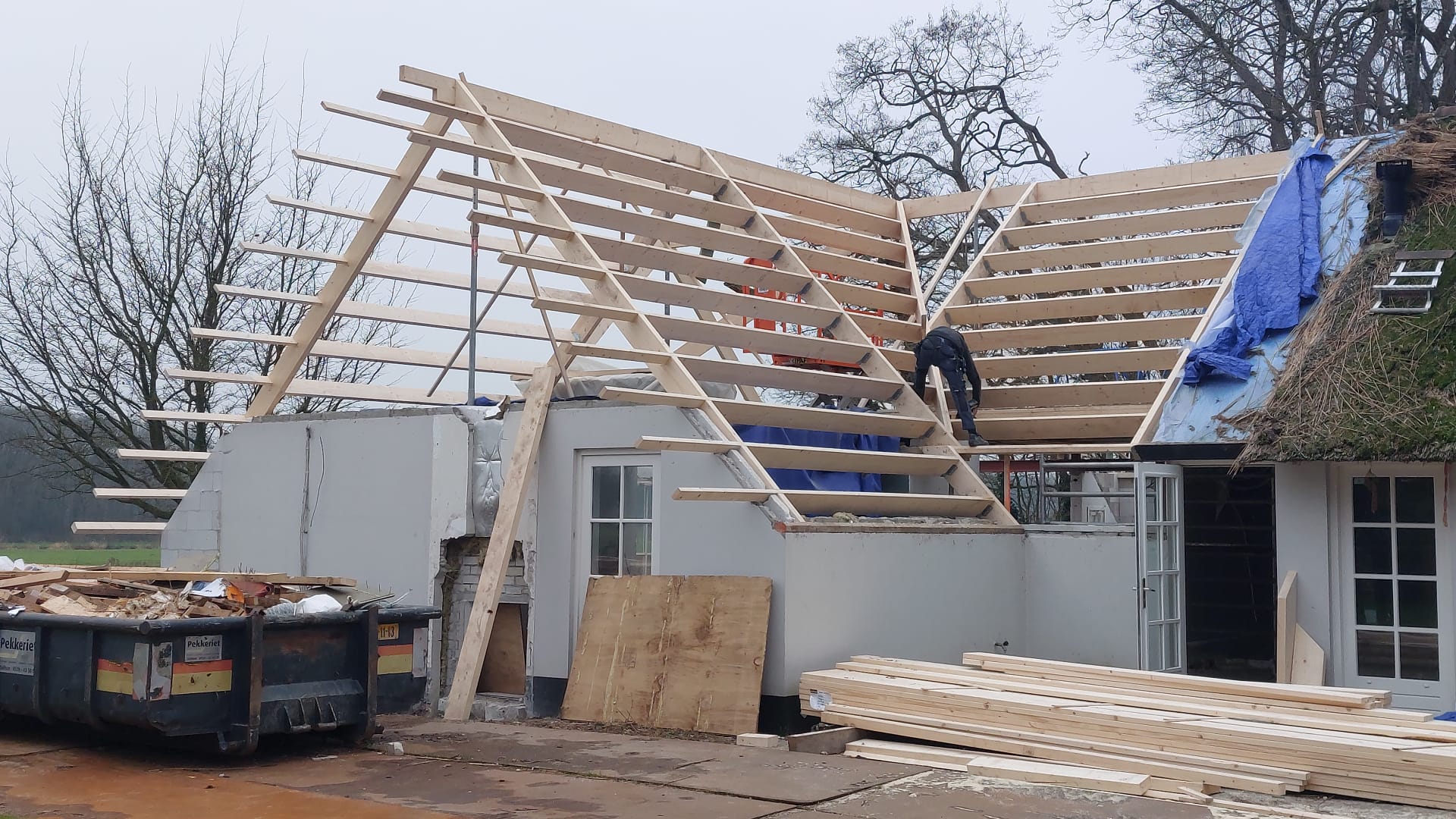 Bij deze woning zijn wij volop bezig met een mooie verbouwing. Een groot deel van de bestaande gevels blijft behouden, terwijl het dak volledig wordt vernieuwd. Het nieuwe rieten dak begint al vorm te krijgen en zal de woning straks een karakteristieke en warme uitstraling geven.